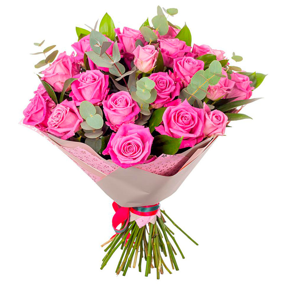 Роза одноголовая розовая, эвкалипт. Упаковка (лента, пленка, крафт, сетка, пленка матовая)